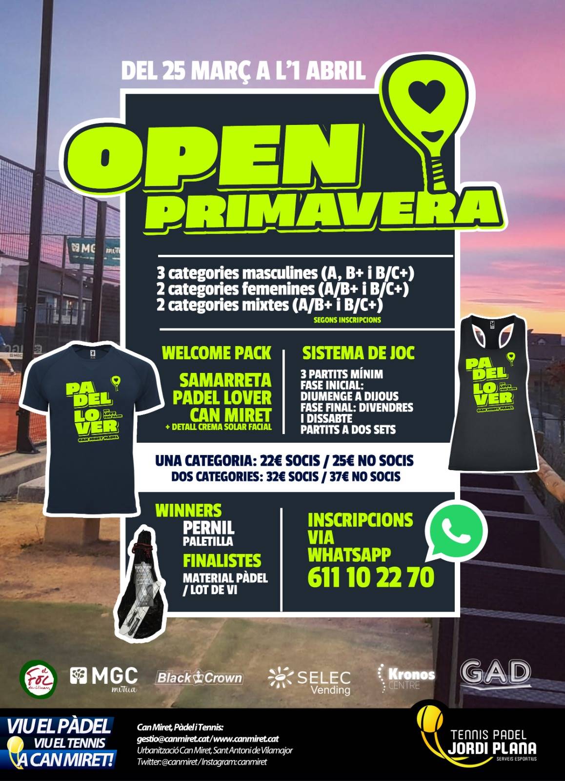 Per començar, tots els participants del torneig s'enduran la magnífica samarreta PADEL LOVER de welcome pack.