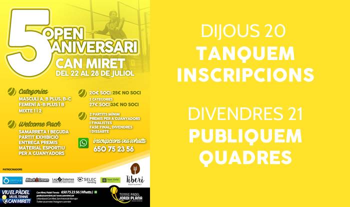 6 dies per apuntar-se al OPEN 5 ANIVERSARI DE CAN MIRET!